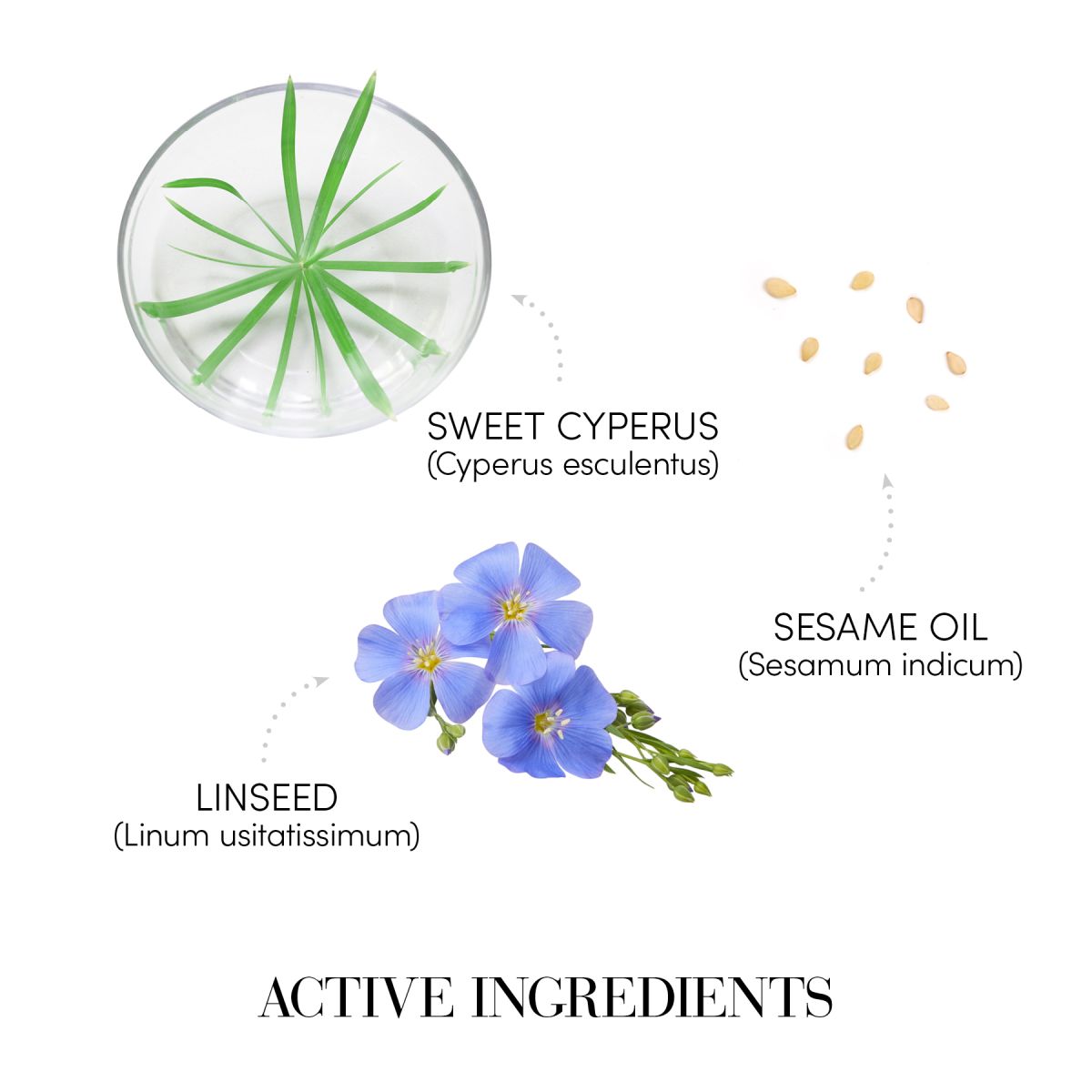 Huile de souchet : Revitalise et nourrit intensément les cheveux sans les alourdir, facilitant le démêlage et le coiffage.